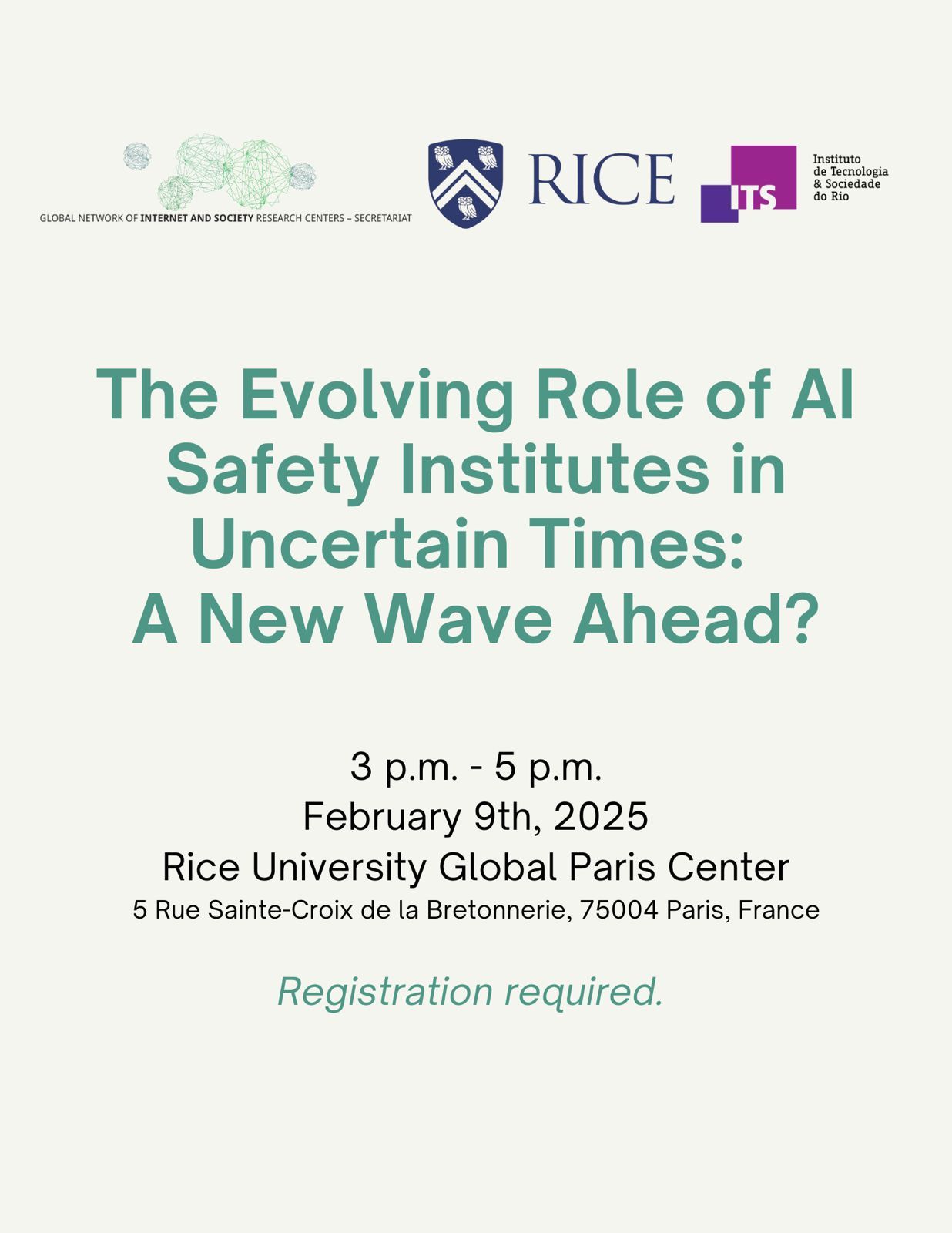 Dear All, In collaboration with our colleagues at ITS Rio and Rice University, the NoC Secretariat is pleased to invite you to the event The Evolving Role of AI Safety Institutes in Uncertain Times: A New Wave Ahead? This hybrid event will be a side event to the AI Action Summit, in Paris. Find more information about the event here<https://docs.google.com/document/d/14kcTjW7T5b9jjN7clYFaFM1pXuQ_D7BSTMjy1jmr...>. The final agenda will be shared with participants in the coming days. Please find the details for the event below: * Date: Sunday, February 9th * Time: 3:00 PM - 5:00 PM CET. * In-person location: Rice University Global Paris Center: * 5 Rue Sainte-Croix de la Bretonnerie, 75004 Paris, France Attendance in Person: Registration is required to participate. To attend in person, please register using this form<https://docs.google.com/forms/d/e/1FAIpQLScncz5_PzrQ7iV3loy2EF3EE5JTQ_XWDEVG...>. Please note that spots are limited, and access to the venue will not be permitted without prior registration. Instructions on how to access the venue will be sent to registered participants on the day of the event. Attendance in Person: Remote connection to the event will also be available. Please register here to join the event on Zoom.<https://us06web.zoom.us/meeting/register/W9XE_e-fSWuUpRkoNq5CnQ> We’re looking forward to an insightful conversation ahead of the AI Action Summit! Best regards, Armando — On behalf of the event organizers [cid:ecb5252d-2310-4eeb-ad03-1ca4591ab42c]