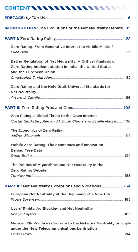 And here is the content of the book on Net Neutrality that was missing in the previous email (apologies :) [cid:de6301f5-dc54-46a1-9b32-b21adda53292] Dear all, (apologies for crossposting) The UN Internet Governance Forum is starting next week and CTS/FGV will be promoting 3 books that might be of your interest: * Terms of Service and Human Rights. The book has been developed in partnership with the Council of Europe. It analyses the compatibility of the terms of service of 50 of the most popular online platforms with international human rights standards. It also includes the Recommendations on Terms of Service and Human Rights,<http://www.intgovforum.org/cms/documents/igf-meeting/igf-2016/830-dcpr-2015-...> one of the IGF 2015 outcomes, developed by the IGF Dynamic Coalition on Platform Responsibility<https://igf2016.sched.org/event/8huv/dc-on-platform-responsibility>, last year. * Net Neutrality Reloaded. Zero Rating, Specialised Services, Ad Bloking and Traffic Management. The book explores the most recent net neutrality trands. 7 out of 10 chapters are dedicated to the various aspects of zero rating practices, a very prominent issue, particularly in developing counties. The book is the annual outcome of the IGF Dynamic Coalition on Net Neutrality<https://igf2016.sched.org/event/8htg/dc-on-net-neutrality>. * Community Connectivity. Building the Internet from Scratch. The book explores alternative models to expand connectivity in a sustainable fashion. The first part focus on community networks' governance while the second one analyses a series of case studies. Together with the Declaration on Community Connectivity<http://www.intgovforum.org/multilingual/index.php?q=filedepot_download/3737/...>, the book is the annual outcome of the IGF Dynamic Coalition on Community Connectivity.<https://igf2016.sched.org/event/8htn/dc-on-community-connectivity> Below, you can find the book contents. Free hard copies of the books will be distributed at the IGF. Here is CTS/FGV schedule<https://igf2016.sched.org/ctsfgv>, should you be interested in joining us and have your copy of the books. The Open Access versions will be released right after the IGF, under Creative Commons Licenses. I would like to thank all those who participated in the development of the books (notably those who are in this mailing list) for their great contributions. Please do not hesitate to circulate this email to any interested person. Best regards, Luca ----------------------------------------------------------------------------------------------- Luca Belli, PhD Senior Researcher, Center for Technology & Society, FGV Rio de Janeiro Chercheur Associé, Centre de Droit Public Comparé, Université Paris 2 Head of Internet Governance @ FGV internet-governance.fgv.br<http://internet-governance.fgv.br> -----------------------------------------------------------------------------------------------