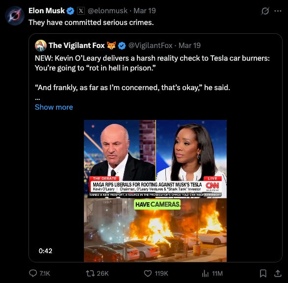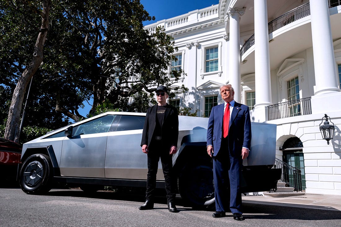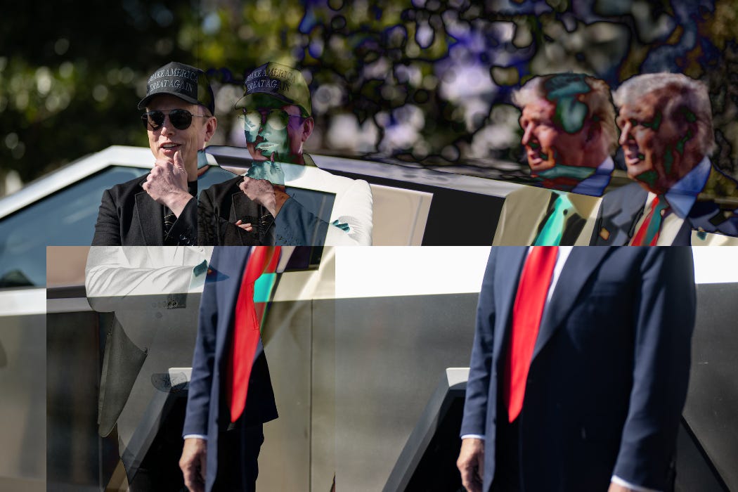 On X, where so many of these images rain down—the deportation porn promoted by the site’s owner, the posts featuring charred EVs swimming against the algorithmic currents—Elon Musk attacks judges whose injunctions are slowing the mass deportation effort, retweets broadsides against political opponents, and boosts accounts that come to the defense of Tesla, including but not limited to the new Director of the FBI, Kash Patel. On Monday, Patel affirmed on the platform that the bureau would be investigating property crime against Musk’s electric car company as domestic terrorism, and earned himself an RT from Musk in the process. Patel joins US attorney general Pam Bondi, commerce secretary Howard Lutnick, and president Trump himself in circling the executive wagons around Musk’s car company, launching a federal task force to investigate vandalism against Teslas and Tesla dealerships. Three men who have been arrested for three different incidents of vandalism on Tesla property—in South Carolina, Colorado, and Oregon—now face twenty years in prison on terror charges brought by Bondi’s Department of Justice. In case the threat of retribution for dissent wasn’t made clear by all the due process-free imprisonments and deportations, Trump went ahead and made the link explicit: “I look forward to watching the sick terrorist thugs get 20 year jail sentences for what they are doing to Elon Musk and Tesla," he wrote in a Truth Social post. "Perhaps they could serve them in the prisons of El Salvador, which have become so recently famous for such lovely conditions!" It’s not all bluster. As WIRED’s Caroline Haskins reports, the domestic terror designation gives federal and local law enforcement new powers to surveil protestors, and for Musk and DOGE to access data turned up in the investigations. In other words, the richest man in the world, the owner of seven tech companies—including the most important right-wing propaganda platform—whose wealth is bound up in part in the value of a car company, is facilitating the state response to people protesting his unelected role in dismantling federal services and accelerating the drive to authoritarianism. So here we are. It has been simultaneously surreal, disturbing, and continuously unsurprising to watch this unfold. After decades of worsening income inequality, of the hollowing out of state capacity, of concentrating power among the ultra-rich, this is reality now. Considering the new heights of influence reached by the Silicon Valley tech giants, and the emboldenment of the titans who run them; the notion that the most erratic, richest, and most desperately approval-seeking among them would seize power? Well, it tracks.¹ Of course there’s Elon Musk, installing StarLink wifi in the White House, and well obviously he is positioning himself to receive billions in federal contracts and why wouldn’t he be on the White House lawn, televising a car commercial as a news conference, alongside the US president? The only thing that feels truly shocking at this point is that Musk isn’t using Grok in DOGE’s new government AI chatbots, and is opting for Anthropic’s Claude instead, for the time being, anyway. Look, sure, the American oligarchy’s power has been effectively entrenched for years, but there’s something striking about its final, open presentation in the White House, in the pretenses being effortlessly peeled away like the paneling on a Cybertruck. Musk’s omnipresence and power brokering in the oval office, the notion that his presence there might even need to be explained at all a distant afterthought. The naked favor trading, the self-dealing, the old grifts with new coats of paint; the crypto and AI czar whose VC firm is heavily invested in crypto and AI companies. The defense tech contractor who publicly squeals with delight over the prospect of killing enemies of the state for profit. Perhaps it took Silicon Valley’s penchant for disruption to render the tried and true robber baron model of wielding influence from the sidelines obsolete. Power once acquired through corporate lobbying, the funding of influence groups, or via the occasional Congressionally-vetted cabinet post, is now openly and casually seized. Perhaps it took the wealth, ego, and entitlement of a Silicon Valley CEO to push through this final breach, his claims to futurity paving over audible protests and human rights injustices. The other striking thing is just how tenuous it all is. As has been pointed out by folks like Hamilton Nolan and Tesla critic Eric Niedermeyer, Musk’s fortune, while vast, is less secure and more vulnerable than it appears. An ideal foil for Trump, Musk’s immense wealth and power is bound up in the long-gestating and self-cultivated mythology of his immense wealth and power. PayPal made him a multimillionaire, and SpaceX multiplied his fortune, but it’s Tesla that made him the richest man on Earth. And starting in the mid-2010s, when Musk began promising full self-driving features and robotaxis, Tesla’s value—not to mention Musk’s net worth—has been uniquely dependent on the successful cultivation of fantasies that have yet to materialize. That historic wealth, along with his loyalty, is what validates Musk to Trump—he’s got the richest guy in the world running the government for him. Just like Trump always ostentatiously prioritized being perceived as a successful business magnate over actually operating as one, Musk, who really did build some successful companies, has continuously and exponentially inflated their value, potential, and power. A man who both is and pretends to be an ultrarich businessman and a man who both is and pretends to be an ultrarich tech entrepreneur are running the country.² It’s an oligarchy of speculative wealth and power made real; an oligarchy of science fiction, even. That the fiction can be punctured to great effect is the insight central to the Takedown protests,