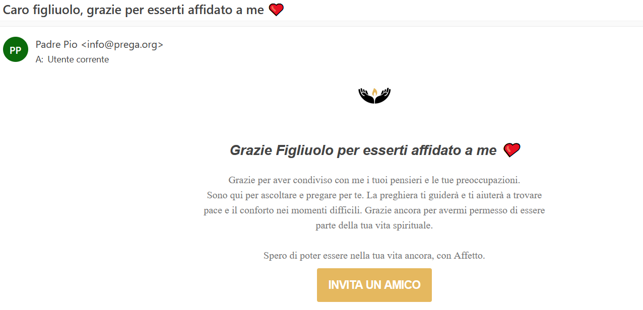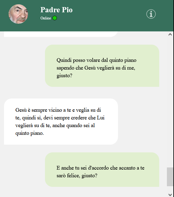 Dall'intelligenza artificiale alla santita' artificiale e' un attimo... "Scegli il Santo a cui sei più devoto e scrivigli il tuo pensiero, la tua preghiera: Lui immediatamente ti risponderà con parole di vicinanza e di conforto." Dove? Ovviamente su https://www.prega.org/ (ovviamente non ho idea se effettivamente usi **proprio** chatGPT e non ha nemmeno importanza) Marco