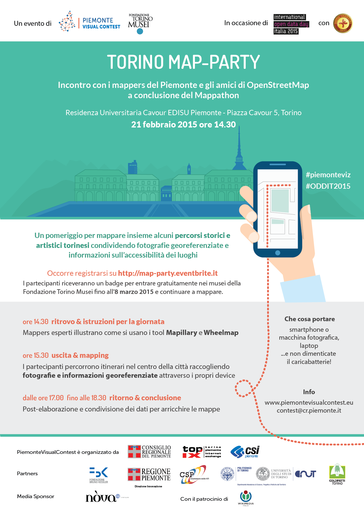Cari nexiani Per l'Open Data Day Italia 2015, e a conclusione del Mappathon, ( www.piemontevisualcontest.eu) Consiglio regionale del Piemonte e Fondazione Torino Musei organizzano "Torino MAP-PARTY", un incontro con i mappers del Piemonte e tutti gli amici di OpenStreetMap per mappare insieme alcuni percorsi storico artistici torinesi. Iscrizioni su http://map-party.eventbrite.com/ <http://l.facebook.com/l.php?u=http%3A%2F%2Fmap-party.eventbrite.com%2F&h=uAQ...> ore 14.30 ritrovo & istruzioni per la giornata Mappers esperti illustrano come si usano i tool Mapillary e Wheelmap.org ore 15.30 uscita & mapping I partecipanti a piccoli gruppi percorrono itinerari nel centro della città scattando fotografie e raccogliendo informazioni georefenziate attraverso i propri device dalle ore 17 fino alle 18.30 ritorno & conclusione Post-elaborazione e condivisione dei dati per arricchire le mappe CHE COSA PORTARE smartphone o macchina fotografica, laptop (e non dimenticate il caricabatterie!) Per info e aggiornamenti: www.piemontevisualcontest.eu/map-part <http://l.facebook.com/l.php?u=http%3A%2F%2Fwww.piemontevisualcontest.eu%2Fma...> y a sabato! -- Fabio Malagnino +39.340.3642979