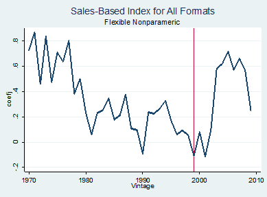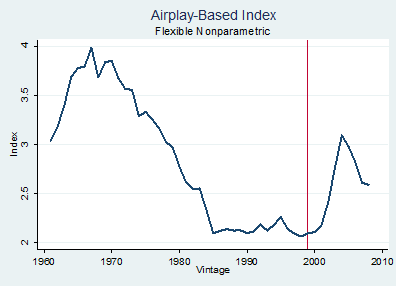 http://www.voxeu.org/index.php?q=node/7274 Is the Sky Falling? The quality of new recorded music since Napster Joel Waldfogel <http://www.voxeu.org/index.php?q=node/4194> 14 November 2011 / Napster -- the first peer-to-peer file sharing service -- changed the music industry forever. Many people now download music without paying, often illegally. This column looks at the effect on the music industry, in particular what it means for the quality of new recorded music. / A dozen years ago a program was created called Napster. It made it easy for ordinary people to download music from their friends and people they had never met. Despite the rock 'n' roll ideals of free music for everyone, it changed the music industry forever -- some would say for the worse. Since then, intellectual property rights have been substantially weakened. Unfettered stealing has caused revenues to the recorded music industry to tumble by roughly one third. While this reversal has prompted academic chin-scratching over its cause, most observers now agree that consumers' ability to steal music undermines firms' ability to sell it.^1 <http://www.voxeu.org/index.php?q=node/7274#fn> The woes of the recorded music industry, along with fears of the movie, television, and book industries, have led many to advocate stronger legal protections for intellectual property, including private lawsuits, and threats of disconnection from internet service. While the question of whether stealing undermines selling is of vital interest to the recorded music business, it is arguably not the only important question for evaluating the success of intellectual property rules. The purpose of copyright laws is to provide incentives for the creation of new works. Weakened intellectual property protections present a threat to consumers as well as producers. If producers cannot appropriate sufficient revenue to cover their costs, they may stop bringing new products to market, causing harm to consumers as well as producers. Keeping this in mind focuses attention on a different question. What has happened to the volume -- and quality -- of new works since Napster? Three approaches to documenting quality Documenting the volume of high-quality work is challenging, but in recent work I have developed three approaches to characterising the evolution of music quality over time. The first approach makes use of critics' retrospective best lists, such as Rolling Stone's list of the 500 best albums of all time.^2 <http://www.voxeu.org/index.php?q=node/7274#fn> Inclusion of a work on such a list means that it has quality above some time-constant threshold. Each list can be transformed into an index showing the number of listed works originally released in each year. I have 88 such lists from Anglophone sources, together covering the period between 1960 and 2010. These lists' associated indices can be combined statistically to produce an overall index of music quality. As Figure 1 shows, the index rises from 1960 to 1970, then falls, remaining low during the 1980s. The index rises during the first half of the 1990s, then falls in the second half. Following 2000, the decline stops, and the index is flat. The critic-based index provides no evidence of a decline in recorded music quality since Napster. *Figure 1* The second and third approaches make use of information on the service flow of recorded music, based on sales and radio airplay, by time and vintage.^3 <http://www.voxeu.org/index.php?q=node/7274#fn> For example, I observe the share of music on US radio in 2008 that was originally released in 2008 and each preceding year. I observe the analogous vintage distribution for music aired in each year back to 2004. I also observe coarse data on music sales by year and vintage, so I observe the share of music sold in, say, 2010 that was originally released in 2010 and in each previous year. I observe analogous sales data back to 1970. In any given year, shares vary across vintage for two reasons. First, music depreciates - music sells less, and is played less on the radio, as it gets older. Second, vintages may differ in their quality. If the quality of music had declined after 2000, then we would expect elevated use of older vintages after 2000, controlling for deprecation. Thus, if I can account for depreciation, the remaining variation in use by original vintage should reflect vintage quality. To this end, I regress the log share of music used in a year t from vintage v on a flexible set of age dummies (to account for depreciation), along with a flexible set of vintage dummies. The coefficients on vintage dummies show the evolution of vintage quality over time. The results Results are interesting. The airplay data allow me to infer vintage quality back to 1960 and exhibit the following pattern (in Figure 2) - quality rises from 1960 to 1970, then falls and remains flat from 1980 to about 1999, with a small bump up in the mid-1990s. After 2000, vintage quality rises sharply, reaching levels not seen since the 1970s. The sales data, which produce an index going only back to 1970, suggest a similar story - vintage quality declines from 1970 to 1980, is flat to 2000, then rises after 2000 (see Figure 3). Two points are in order about these results. First, the three approaches, while independent of one another, produce broadly similar patterns from 1960-2000. Second, none of the three approaches shows a decline in quality following 2000; and two of them -- based on actual music usage -- show substantial increases. *Figure 2* *Figure 3* These results are, at first blush, puzzling -- how could the flow of high-quality music continue despite sharp reductions in firms' ability to appropriate revenue. The puzzle's resolution may lie in the observation that technological change has not only reduced effective demand; it has also reduced costs of bringing music to market. The costs of creation, promotion, and distribution have all been revolutionised by new information a