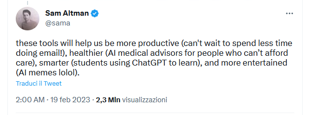Mentre continuo a veleggiare su ChatGPT con una banalissima VPN, mi inoltro in qualche tentativo di ragionamento. Immagino che il Garante abbia valutato che le garanzie di protezione dei dati personali fornite da OpenAI siano insufficienti, e non ho ragione di credere che tali valutazioni siano erronee. Ma a questo punto interviene una decisione: diffidare OpenAI e minacciare una multa. A fronte di questa, la società statunitense decide a sua volta di sospendere il servizio in Italia. Entrambe le opzioni mi sembrano fuori misura: da una parte sarebbe bastata, di primo acchito, una richiesta di chiarimenti e un invito alla cautela alla nostra cittadinanza; dall'altra si sarebbe potuto attendere il decorso dei termini della diffida italiana. Siamo pertanto di fronte a una drammatizzazione. L'authority italiana, che non è il Governo ma forse coglie lo 'spirito dei tempi', agisce in modo patriarcale: lo Stato regola i comportamenti dei cittadini riducendo i gradi di libertà e l'agibilità dello spazio pubblico. OpenAI coglie l'occasione per ridurre all'assurdo la posizione di chi critica gli sviluppi e gli impieghi della loro loro tecnologia. Vittime di questa drammatizzazione sono coloro che in tutto il mondo stanno cercando di costruire uno sviluppo sostenibile, sicuro e sociale delle tecnologie. G. On Sat, 1 Apr 2023 at 11:19, Enrico Nardelli <nardelli@mat.uniroma2.it> wrote: