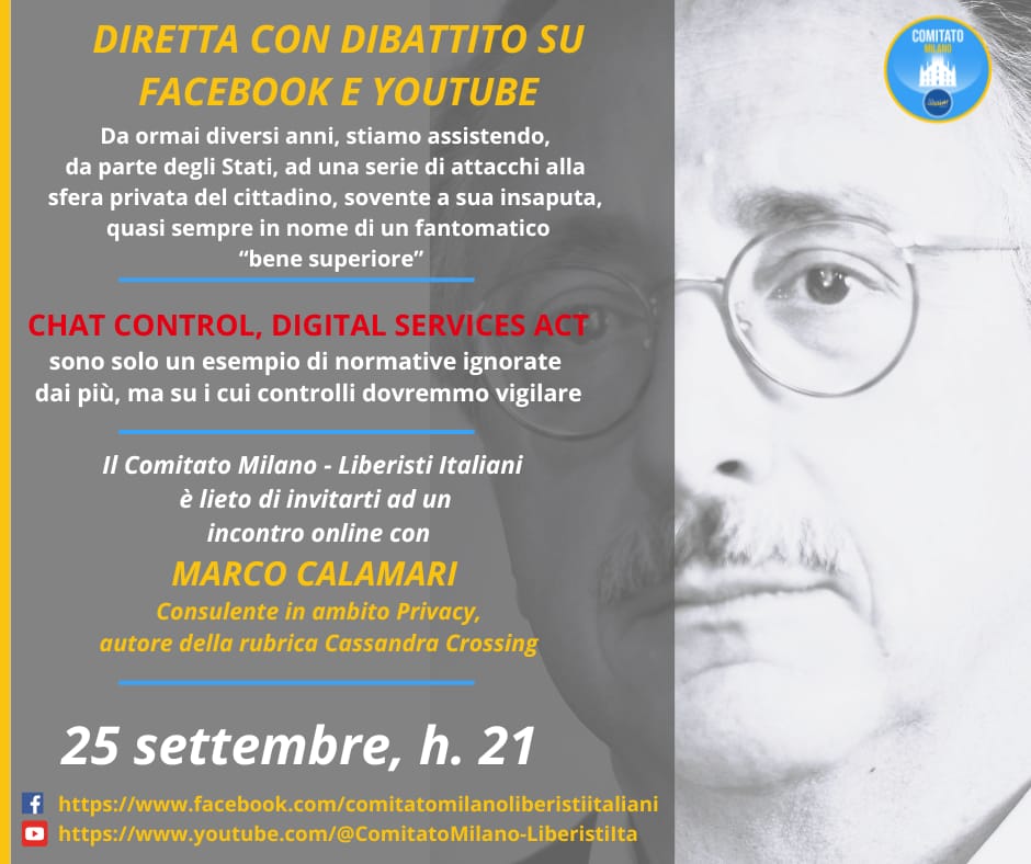 Alla fine siamo riusciti a organizzare, grazie pubblicamente a Marco Calamari per la disponibilità Allego locandina https://www.youtube.com/@comitatomilano-liberistiita -- Andrea Trentini ⠠⠵ http://atrent.it public key ID: 0xA7A91E3B Dip.to di Informatica Università degli Studi di Milano