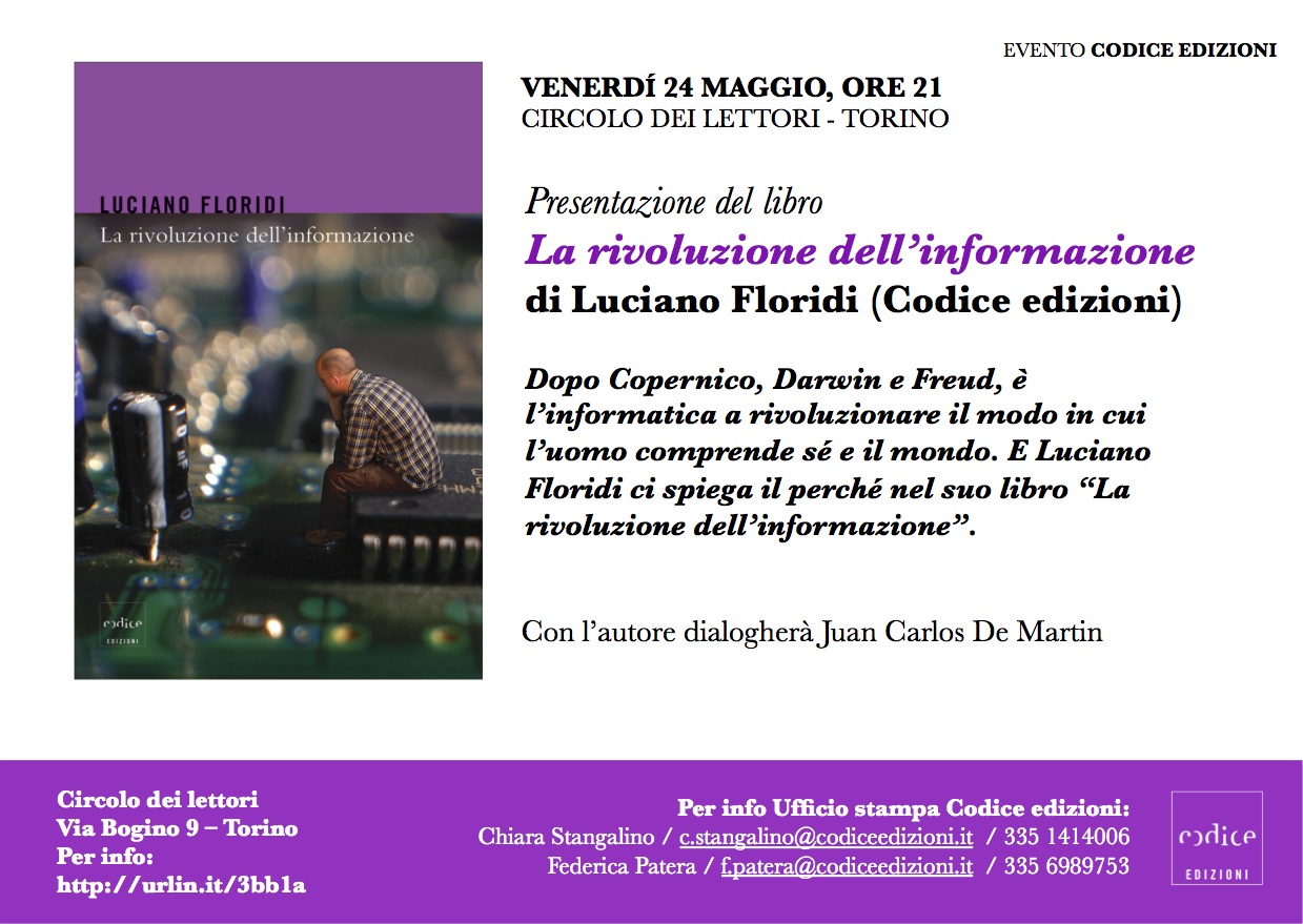 Nuova opportunità per incontrare il prof. Luciano Floridi, oltre al talk di domani mattina al Politecnico (http://nexa.polito.it/2013-floridi-onlife-manifesto). jc