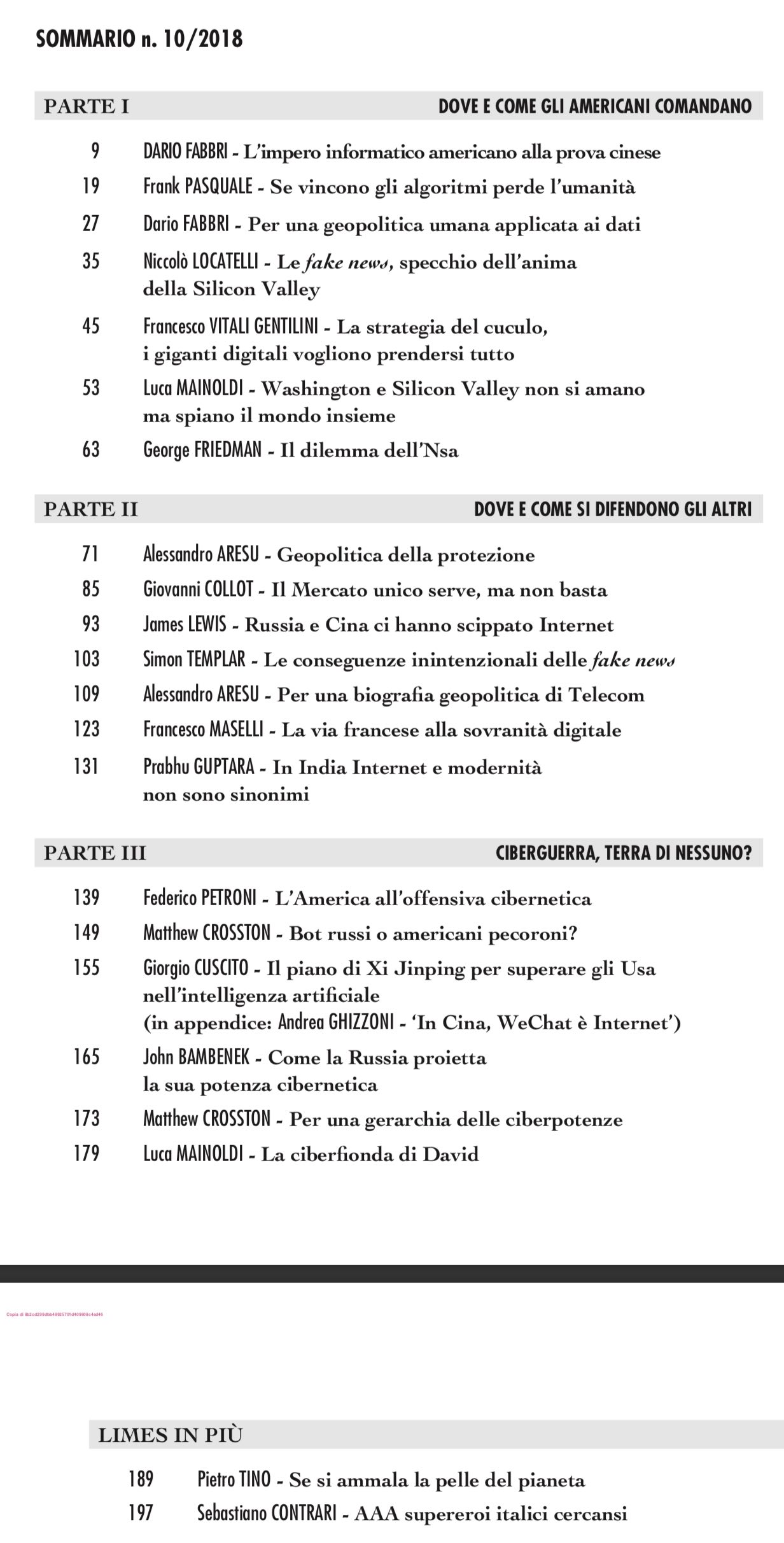 Vi segnalo che l'ultimo numero di Limes, in mensile di geopolitica, è intitolato: "La Rete a stelle e strisce". In allegato l'indice. Online questo articolo: http://www.limesonline.com/cartaceo/limpero-informatico-americano-alla-prova... Un caro saluto, juan carlos