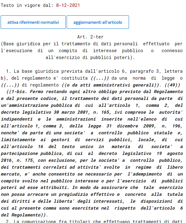 Dopo ~40 minuti passati su "www.normattiva.it", giocherellando con "aggiornamenti al titolo", "aggiornamenti alla struttura", "attiva riferimenti normativi", "aggiornamenti all'articolo"... ho deciso che è piu' semplice se allego lo screenshot e invito tutti gli interessati a consultare direttamente normattiva Aggiungo solo che il riferimento all'art. 6 del Regolamento... è relativo all'articolo 6 del GDPR, il cui testo ufficiale, in Italiano, è qui: