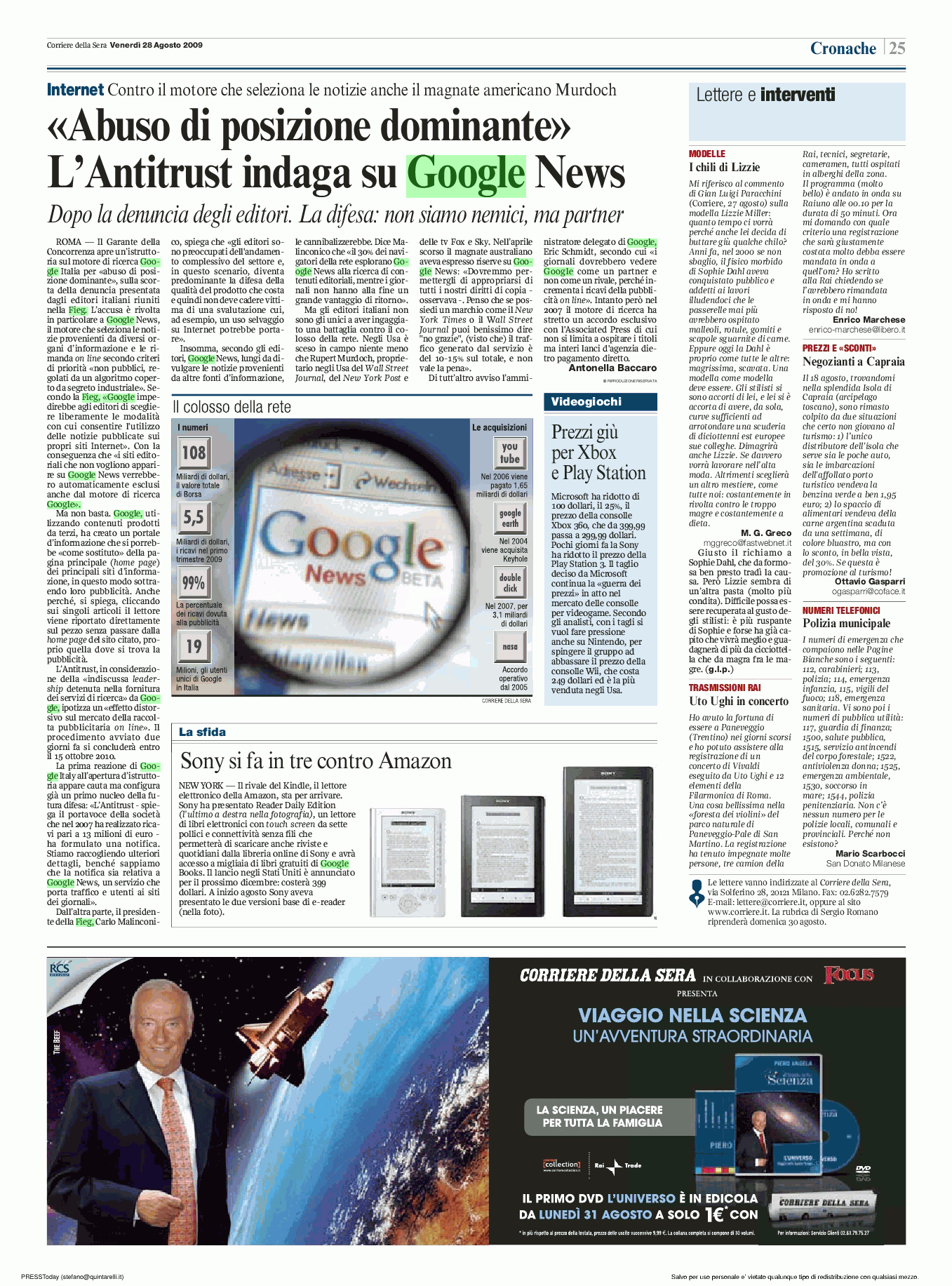 "E' possibile che abbiate letto oggi sulla stampa italiana che l'Antitrust ci ha notificato un'indagine in relazione a Google News come conseguenza di una segnalazione della FIEG (Federazione Italiana Editori di Giornali). In questo momento stiamo rivedendo la notifica in dettaglio, ma nel frattempo abbiamo pensato che fosse utile fare chiarezza sul meccanismo con cui gli editori possono controllare i loro contenuti sul web. Primo, l'obiettivo di Google News è sempre stato quello di mettere a disposizione prospettive diverse su una notizia e di portare i lettori di tutto il mondo sui siti degli editori. Noi non visualizziamo le notizie nella loro completezza, piuttosto il nostro approccio è simile a quello che adottiamo per la ricerca su web: mostriamo semplicemente il titolo della notizia, una o due righe di testo e poi il link al sito dell'editore. Insomma, giusto le informazioni utili perché il lettore sia invogliato a leggere l'intero articolo. Una volta che l'utente fa click sul link e viene reindirizzato all'articolo, sta all'editore decidere come trarre profitto dal contenuto. Il giornale può scegliere se far pagare il lettore per accedere all'intero articolo oppure può ospitare pubblicità sul proprio sito. Chi fornisce notizie, analogamente a qualsiasi altro editore online, ha il pieno controllo sul fatto di rendere visibili i propri contenuti attraverso i servizi di Google. Quindi, se un editore non vuole essere trovato su Google.com o su Google.it o su un altro motore di ricerca, può evitare l'indicizzazione automatica utilizzando uno standard universalmente accettato, chiamato robot.txt. Gli editori hanno anche una serie di altre modalità per controllare come i loro contenuti appaiono (o non appaiono). Una di queste opzioni è per esempio quella di continuare a comparire nei risultati di ricerca di Google senza comparire su Google News. In questo caso, tutto quello che deve fare è contattarci e richiedere la rimozione dal servizio. In effetti, abbiamo incontrato diversi editori italiani e rappresentanti della FIEG proprio quest'estate per spiegare loro queste opzioni. Noi rispettiamo i desideri dei proprietari del contenuto, ed è per questo che abbiamo fatto in modo che non far parte dei nostri servizi sia semplice. Tuttavia, quando si tratta di Google News, riceviamo di gran lunga più richieste di essere inclusi nel servizio di quante ne riceviamo per la rimozione. Questo è perché gli editori capiscono che il traffico generato da Google News, e da servizi ad esso analoghi, è un traffico di valore: Google News porta oltre 1 miliardo di click al mese agli editori di notizie, molti dei quali traggono profitti da questo traffico grazie alla pubblicità presente sui loro siti." Resto a vostra disposizione per commenti o informazioni.