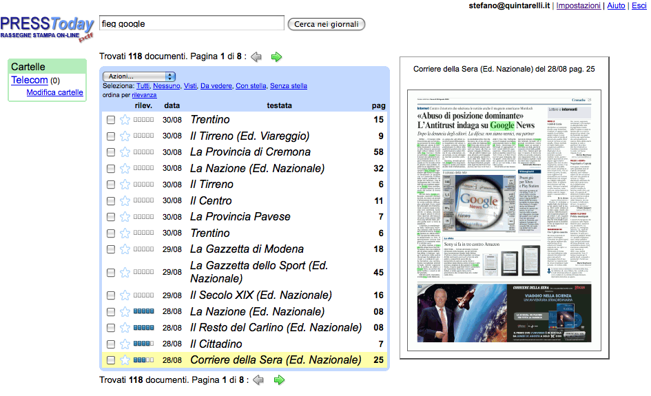 Lo dico perche' ne sono tanto convinto che 2-3 anni prima ho fatto www.presstoday.com che, oltre a cio' che c'e' visibile sul sito, ha un sacco di innovazioni interessantissime: il server per intranet, la produzione di pdf con l'originale delle pagine (con le keyword evidenziate nel pdf !), i riassunti automatici x i cellulari, il supporto di tutti i meccanismi di autenticazione, ecc.