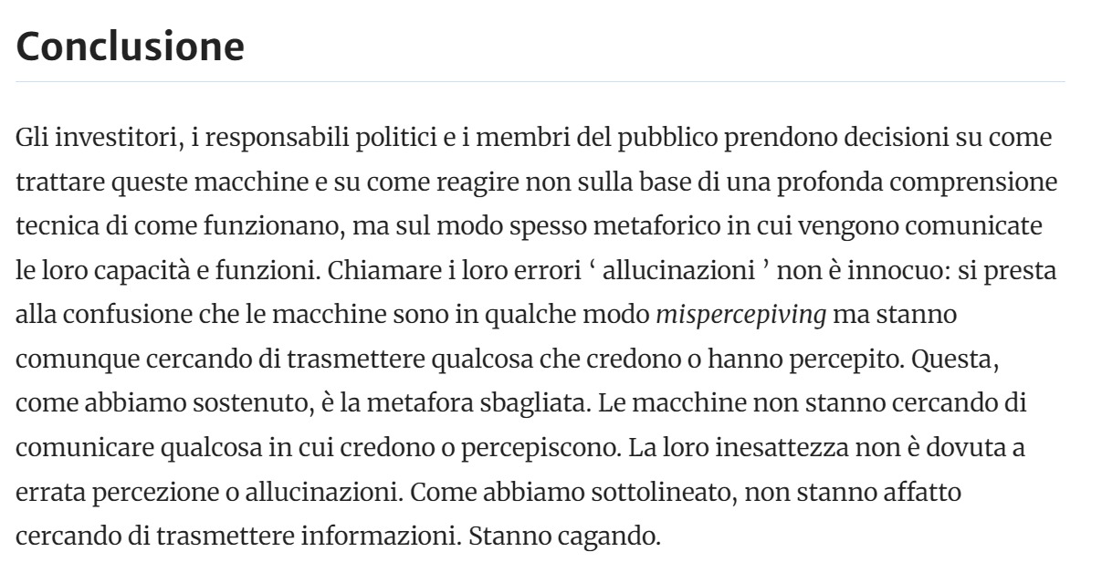 divertentissimo! davvero il bullshitting delle macchine è ricorsivo! :-D per paragone, questo è lo stesso brano tradotto via https://lingva.thedaviddelta.com/: --8<---------------cut here---------------start------------->8--- Conclusione Gli investitori, i politici e i membri del pubblico in generale prendono decisioni su come trattarli macchine e come reagire ad esse senza una profonda comprensione tecnica di come funzionano, ma sul modo, spesso metaforico, in cui vengono comunicate le loro capacità e funzioni. Chiamando i loro errori "allucinazioni" non sono innocue: si prestano alla confusione in cui si trovano le macchine in qualche modo fraintendono, ma cercano comunque di trasmettere qualcosa in cui credono o hanno percepito. Questa, come abbiamo sostenuto, è la metafora sbagliata. Le macchine non stanno cercando di comunicare qualcosa in cui credono o percepiscono. La loro inesattezza non è dovuta a percezioni errate o allucinazioni. COME abbiamo sottolineato, non cercano affatto di trasmettere informazioni. Stanno scherzando. --8<---------------cut here---------------end--------------->8--- puzza meno ma puzza lo stesso :-) questo con il mitico https://www.deepl.com/ --8<---------------cut here---------------start------------->8--- Conclusione Gli investitori, i politici e il pubblico in generale prendono decisioni su come trattare queste macchine e su come reagire ad esse basandosi non su una profonda comprensione tecnica del loro funzionamento, ma sul modo spesso metaforico in cui vengono comunicate le loro capacità e il loro funzionamento. Chiamare i loro errori "allucinazioni" non è innocuo: si presta alla confusione che le macchine stiano in qualche modo percependo male, ma stiano comunque cercando di trasmettere qualcosa che credono o hanno percepito. Questa, come abbiamo detto, è una metafora sbagliata. Le macchine non stanno cercando di comunicare qualcosa che credono o percepiscono. La loro imprecisione non è dovuta a una percezione errata o a un'allucinazione. Come abbiamo sottolineato, non stanno cercando di trasmettere informazioni. informazioni. Stanno dicendo cazzate. Tradotto con DeepL.com (versione gratuita) --8<---------------cut here---------------end--------------->8--- complimentoni deepl.com! [...] saluti, 380° -- 380° (Giovanni Biscuolo public alter ego) «Noi, incompetenti come siamo, non abbiamo alcun titolo per suggerire alcunché» Disinformation flourishes because many people care deeply about injustice but very few check the facts. Ask me about <https://stallmansupport.org>.