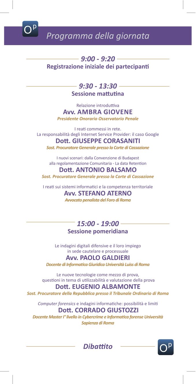 Carissimi, segnalo il Convegno di Studi che si svolgerà a Roma il 16 dicembre prossimo, dal titolo "Il processo penale 2.0. I crimini informatici e le nuove tecnologie". Tutte le informazioni al link: http://www.osservatoriopenale.it/ convegno-op-2016/ Di seguito il programma. Cordiali saluti. Fernanda Faini --- Fernanda Faini *Responsabile Assistenza giuridica egov e open gov - Regione Toscana* *PhD Candidate Università di Bologna (CIRSFID) - **Cultore della materia Università di Firenze* *Presidente Circolo dei Giuristi Telematici* cell: 3385352449 mail: fernandafaini@gmail.com twitter: @fernandafaini facebook: www.facebook.com/fernanda.faini linkedIn: *www.linkedin.com/in/fernandafaini <https://www.linkedin.com/in/fernandafaini>* skype: fernanda_pensiero sito web: *www.fernandafaini.it <http://www.fernandafaini.it/>* --