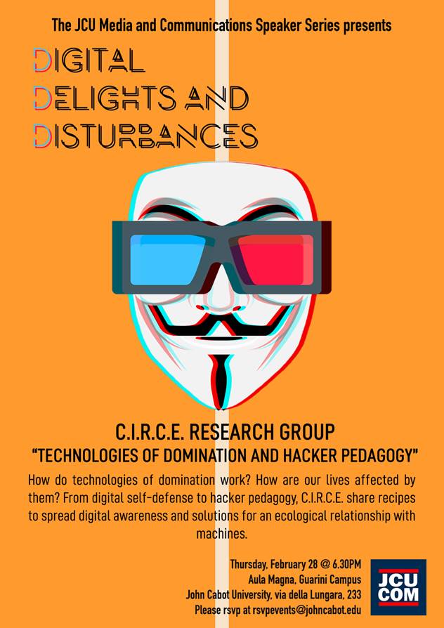 Ciao a tutt* domani alla John Cabot University ospitiamo un talk che potrebbe essere di interesse, qui sotto le info, grazie! Donatella You are cordially invited to “*Technologies of Domination and Hacker Pedagogy”*, *C.I.R.C.E. Research Group* on *Thursday*, *28th February 2019, at 6:30pm* in the *Aula Magna, Guarini Campus*. Kindly RSVP at: https://bit.ly/2DPhetS <https://bit.ly/2DPhetS> C.I.R.C.E. Research Group "Technologies of Domination and Hacker Pedagogy" <https://bit.ly/2DPhetS> bit.ly C.I.R.C.E. Research Group <https://bit.ly/2DPhetS> *Address*: Aula Magna Regina, Guarini Campus, John Cabot University, Via della Lungara 233, 00165 Rome