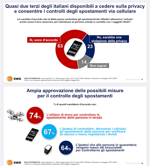Ho ancora qualche domanda: 1. Perché Ferrovie non usa Immuni invece di annunciare questo servizio? 2. Perché se Ferrovie può fare così - e può dunque farlo anche Alitalia, Brambilla Srl., Hotel Moderno, Esselunga con i consumatori tesserati, ecc ecc - perché dunque ci preoccupiamo tanto di Immuni? 3. Se il governo e il Garante hanno stabilito quei vincoli per Immuni perché non intervengono a vincolare anche Ferrovie e chi altri eventualmente ha informazioni simili a Ferrovie? 4. Se non lo fanno, perché non dovrebbero pensare in futuro di rendere Immuni meno vincolata (aggiungendo server centrale e gps)? 5. Swg dice che gli italiani sarebbero per due terzi favorevoli a perdere privacy per avere sicurezza (sondaggio di fine marzo)... questo giustificherebbe questi pensieri?