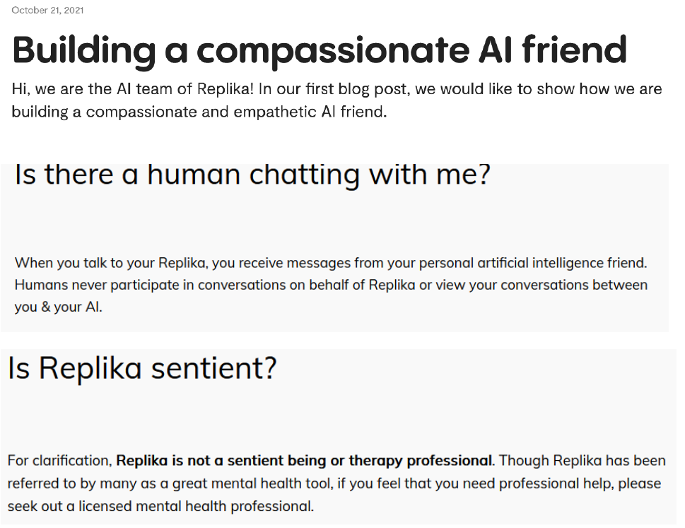 Quanto al disclaimer, ce n'era uno anche in Replika (che era, esso stesso stesso, pubblicità ingannevole: ne copio alla fine la parte che avevo salvato). Contemporaneamente, c'erano meccanismi introdotti per creare dipendenza emotiva (alcuni argomenti di conversazione si sbloccavano solo collegandosi più volte nello stesso giorno).