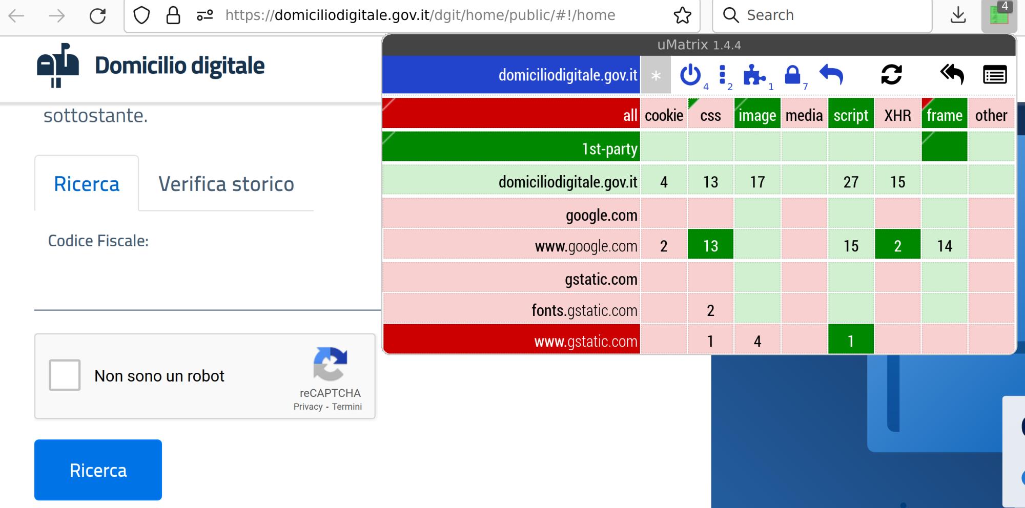 Il nuovo servizio nazionale pubblico (AGID) del domicilio digitale richiede Google recaptcha attivo. Vedi allegato lo schema di permessi richiesti per umatrix. A.