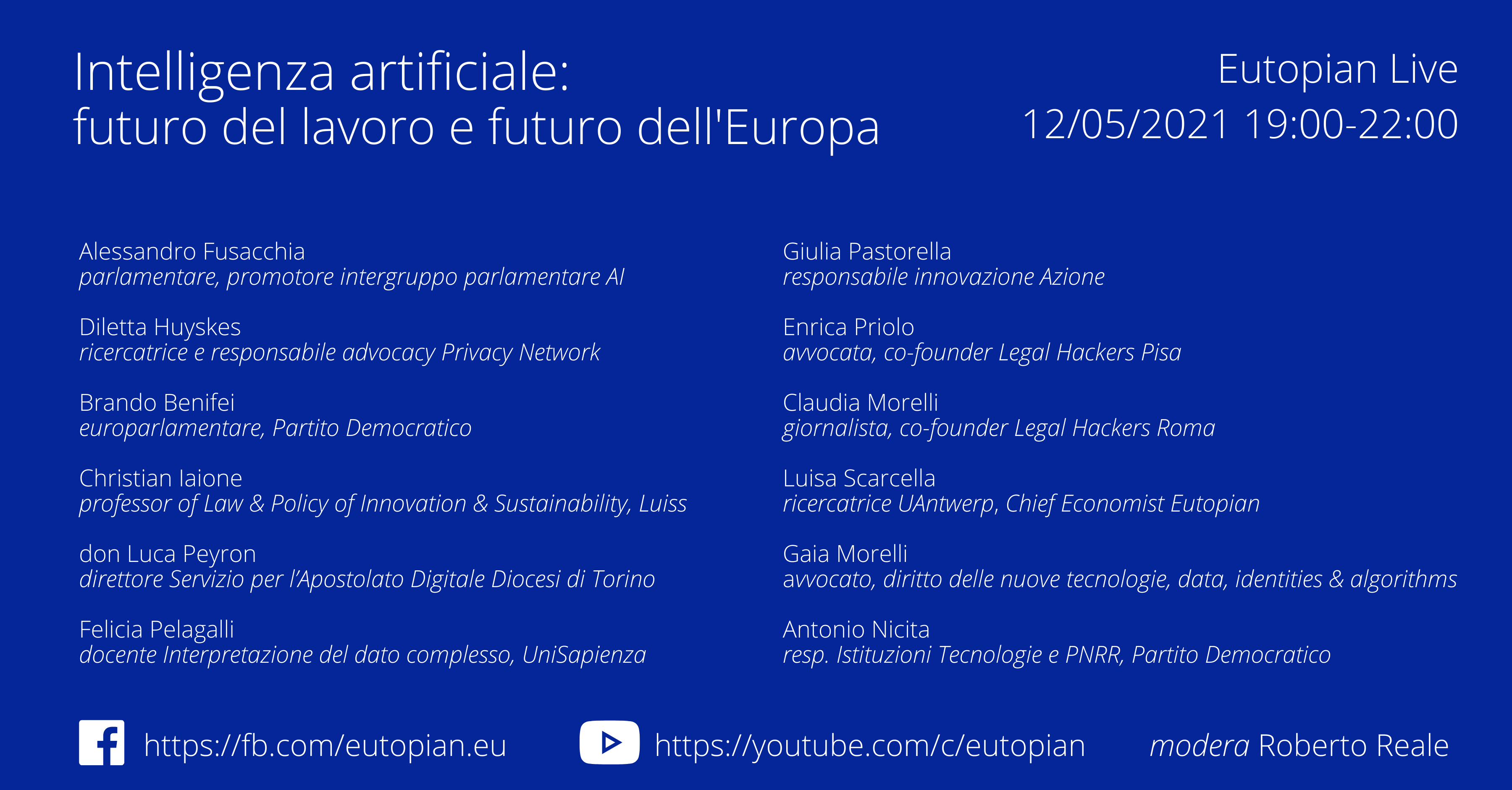 Carissimi, mi permetto di segnalarvi per stasera 12/5 dalle 19:00 alle 22:00 un panel organizzato da Eutopian e moderato da me, a cui partecipano: - Alessandro Fusacchia, parlamentare, promotore intergruppo parlamentare sull'intelligenza artificiale - Diletta Huyskes, ricercatrice e responsabile advocacy Privacy Network - Brando Benifei, europarlamentare, Partito Democratico - Christian Iaione, professor of Law & Policy of Innovation & Sustainability, Luiss Guido Carli - don Luca Peyron, direttore servizio per l'apostolato digitale, Diocesi di Torino - Felicia Pelagalli, docente di Interpretazione del dato complesso, Sapienza Università di Roma - Giulia Pastorella, responsabile innovazione Azione - Enrica Priolo, avvocata, co-founder Legal Hackers Pisa - Claudia Morelli, giornalista, co-founder Legal Hackers Roma - Luisa Scarcella, ricercatrice UAntwerpen, chief economist Eutopian - Gaia Morelli, avvocato, diritto delle nuove tecnologie, data, identities & algorithms - Antonio Nicita, responsabile istituzioni tecnologie e PNRR, Partito Democratico Diretta dalle 19:00 alle 22:00 sui canali social Eutopian: - https://fb.com/eutopian.eu - https://youtube.com/c/eutopian A presto, Roberto -- *Eutopian - Osservatorio europeo sull'innovazione democratica* Lungotevere della Vittoria 9, 00195 Roma - Tel +39 333 741 4032 C.f. 96438490581 EU Transparency register no: 950328639092-74 Registro dei rappresentanti di interessi presso la Camera dei deputati: http://bit.ly/eutopian-camera Registro trasparenza MISE: 2021-62772621-65